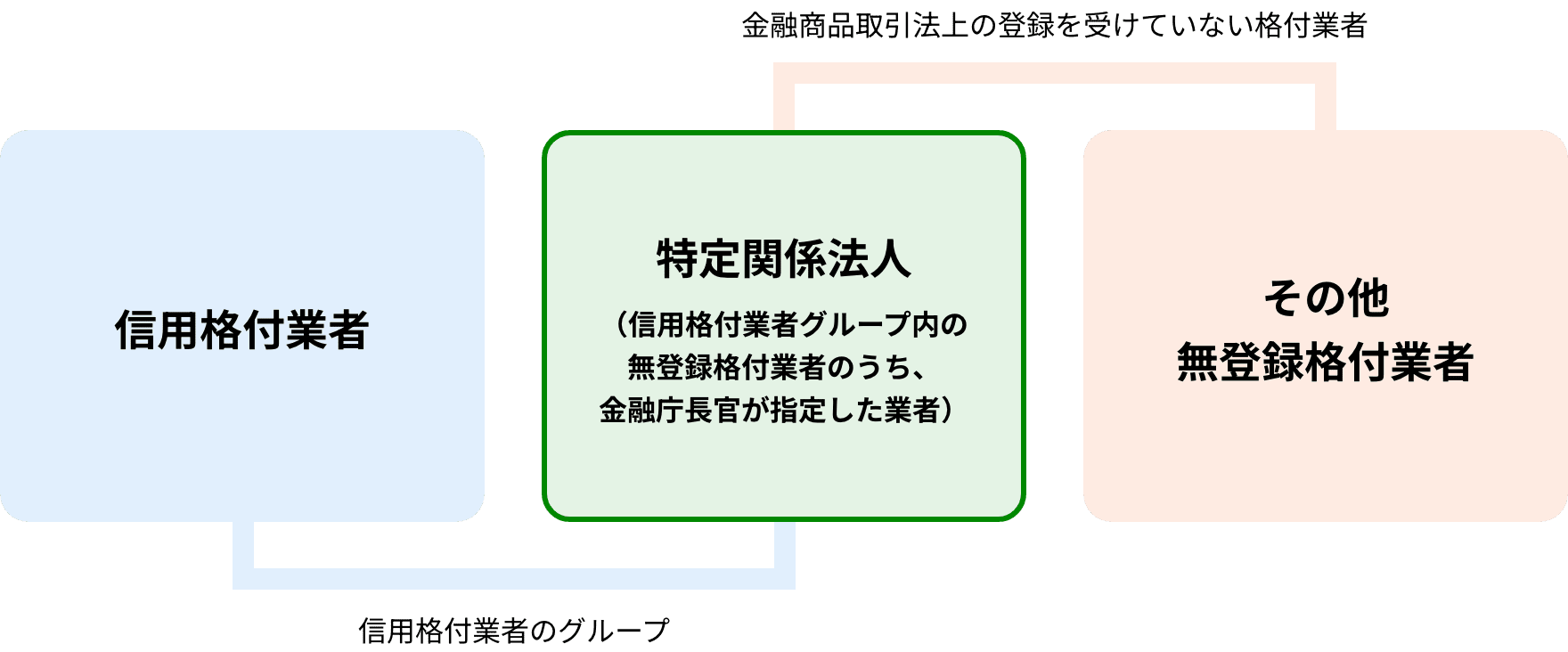 グループ指定制度とは、金融商品取引法第六十六条の二十七に基づく登録を行った信用格付業者が所属するグループ内の無登録業者のうち、一定の要件を満たす業者について、金融庁長官が「特定関係法人」としての指定を行うことにより、当該法人が付与する信用格付に係る説明事項の一部が緩和される制度です(金融商品取引業者等に関する内閣府令第百十六条の三第二項)。